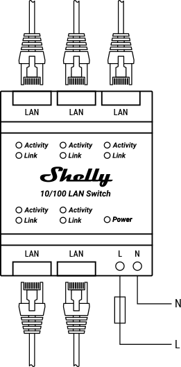 Shelly LAN Switch is a DIN-mountable Ethernet switch with 5 x RJ45 supporting speeds of 10/100 mbps.