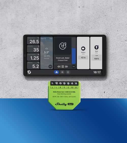 Shelly Wall Display X2 features a 6.95" touchscreen for easy control of lights, temperature, and humidity, with real-time energy monitoring. Shelly Dimmer Gen3 offers smart scheduling for customizable, energy-efficient lighting.