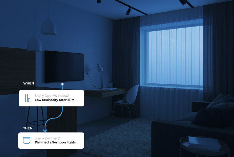 Lasse es zu Hause nicht zu dunkel werden, nur weil es draußen düster und regnerisch ist! Dank seines LUX-Sensors kann der Shelly Door/Window2 so eingestellt werden, dass er dem natürlichen Licht folgt. Somit geht die Beleuchtung an regnerischen Tagen früher an und die Helligkeit wird langsam erhöht, wenn die Abenddämmerung einbricht.