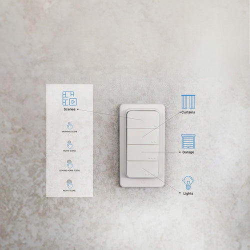 Benutze die vier Tasten, um jede erdenkliche Szene zu aktivieren: Richte eine Morgenroutine ein, um die Jalousien zu öffnen und die Kaffeemaschine in Gang zu setzen. Erstelle eine Filmszene, um das Licht zu dimmen und die Jalousien zu schließen. Und erschaffe eine Szene zum Verlassen des Hauses, die das Licht ausschaltet und die Türen abschließt.