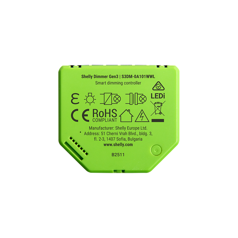 Shelly Dimmer Gen3 (the Device) is a single-channel smart dimming controller which allows remote control of dimmable lights and dimming drivers through a mobile phone, tablet, PC, or home automation system. It can work standalone in a local Wi-Fi network or it can also be operated through cloud home automation services. The Device can be accessed, controlled, and monitored remotely from any place where the User has internet connectivity, as long as it is connected to the Internet. Shelly Dimmer Gen3 has an embedded Web Interface which can be used to monitor and control the Device, as well as adjust its settings. The Device can be used as trailing edge dimmer switch, with or without neutral wire.