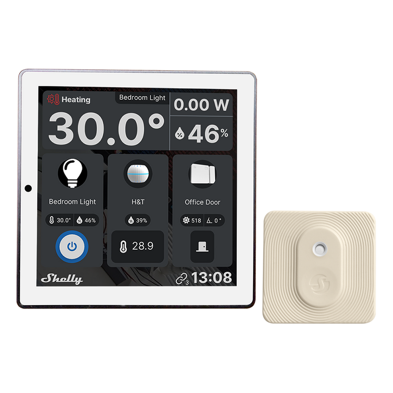 Steuere Deine smarten Geräte mit dem Shelly Wall Display von einem zentralen Ort aus, jetzt in Kombination mit dem Shelly BLU H&T für eine präzise Klimasteuerung