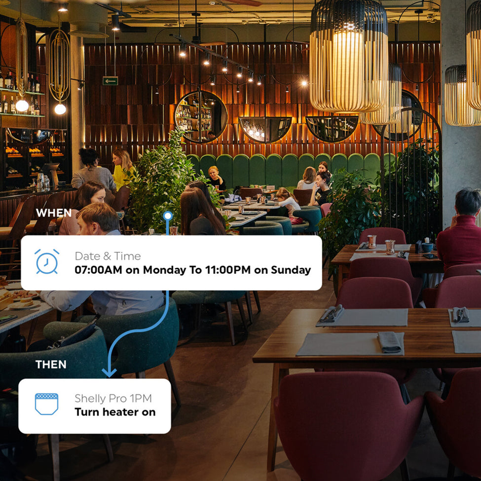 Automatisez et surveillez les appareils de votre restaurant grâce à Shelly. Recevez des alertes si un appareil reste allumé après les heures d’ouverture et définissez des horaires intelligents pour éteindre les appareils inutilisés la nuit et les rallumer avant l'ouverture de la cuisine, réduisant ainsi le gaspillage d'énergie.
