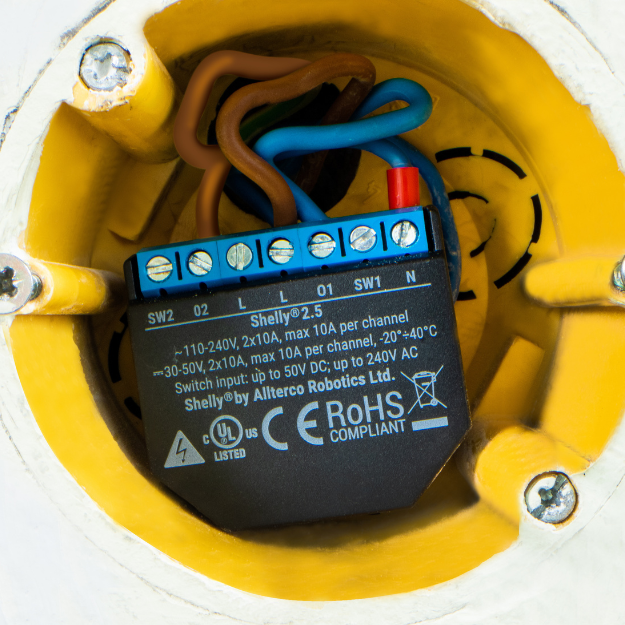 Shelly 2.5 is 2-channel smart relay with cover control and two integrated precise power meters that allow you to measure the consumption for each channel separately. Shelly 2.5 is retrofitted and quick to install but once connected, it can operate as a bi-directional motor control module or control two different circuits on the same phase - for example, lights.