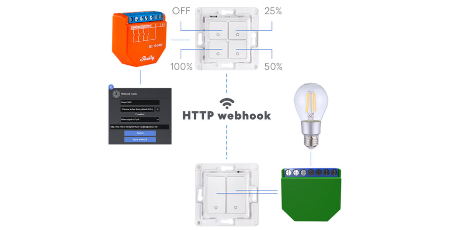 De plus, vous pouvez utiliser Shelly Plus i4 pour régler la couleur de la lumière que vous souhaitez ou pour faire varier l'intensité de vos ampoules connectées. Il vous suffit d'ajouter et de configurer l'un de nos scripts ou crochets web créés spécifiquement pour Shelly Plus i4.