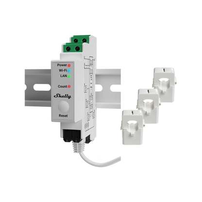 Shelly Pro 3EM est un compteur électrique triphasé montable sur rail DIN. Il fonctionne avec le Wi-Fi, le Bluetooth et la connectivité LAN. Il est aussi doté d'une précision de mesure d'1 % de l'énergie active, ce qui lui permet d'être utilisé pour surveiller la consommation de tous vos appareils électroménagers, circuits électriques et équipements de bureau individuellement. Il stocke les données à intervalles d’une minute pour chaque phase pendant une période allant jusqu'à 60 jours. De plus, ses fonctions de scripts permettent l'exécution de scènes complexes et offrent de plus grandes capacités de surveillance.