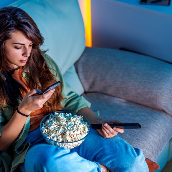 Dimmed background colors set a cinema mood. Shelly Duo RGBW GU10 adds subtle accents and can be dimmed by app or voice without distracting from the screen.