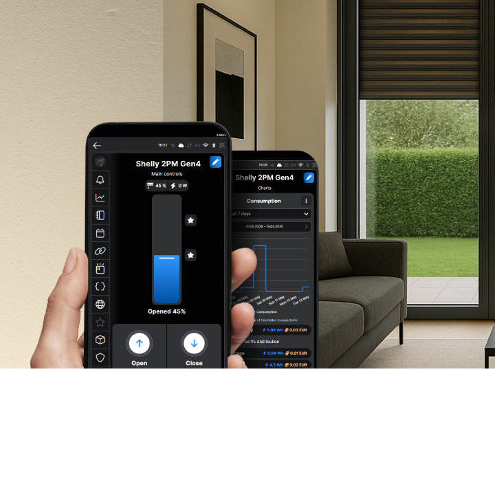 Shelly 2PM Gen4 provides precise monitoring of power consumption and free data storage.
