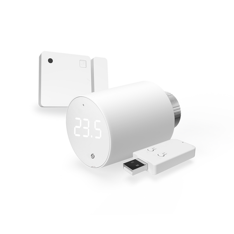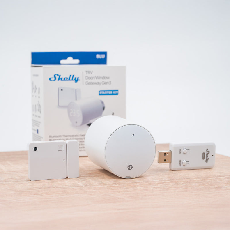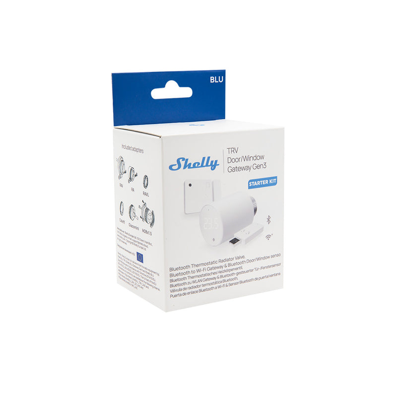 The kit features Shelly BLU TRV smart Thermostatic Radiator Valve head, Shelly BLU Door/Window sensor, and BLU Gateway Gen3 - the perfect combo for smart heating control. Both devices come with batteries.