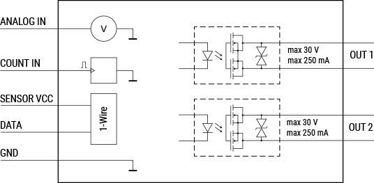 2 potential-free contacts solid-state relay outputs - OUT1 and OUT2