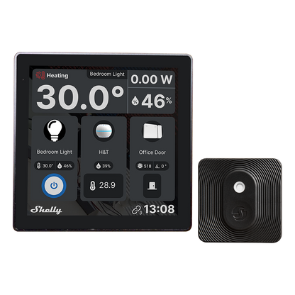 Shelly Wall Display is a sophisticated 4-inch display that brings intuitive control and seamless monitoring to every corner of your smart home. Whether it's dimming the lights, adjusting the room's ambiance, or ensuring optimal energy efficiency, this smart control panel makes home management simple. The highly customizable home screen becomes a reflection of your preferences, offering a quick glimpse of essential home details. Together with Shelly BLU H&T, it can function as a smart thermostat, allowing you to easily fine-tune your heating or cooling.